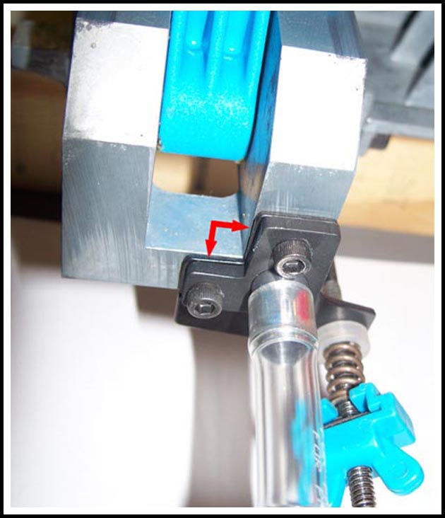 When tightening the screws make sure the Return Bracket and the New Funnel Bracket are aligned with the press bottom so that both edges (shown by the red arrows) clear the handle when the press is cycled.