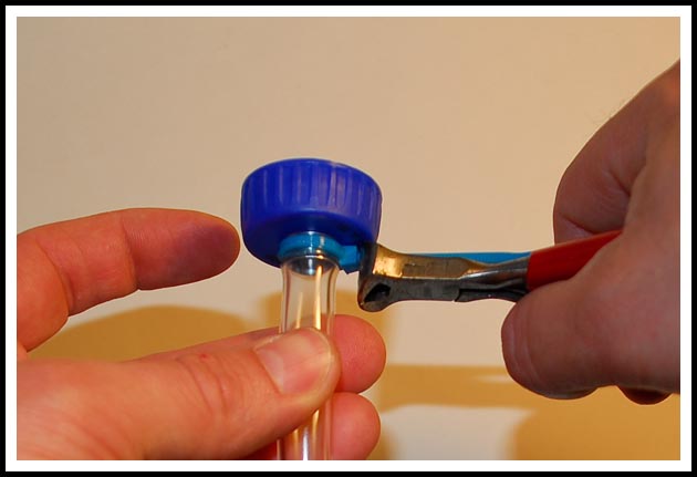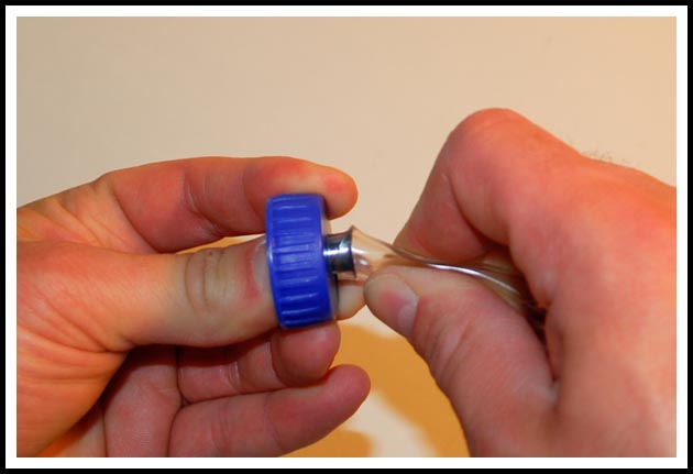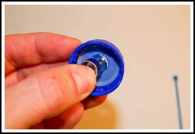 If using a soda bottle double check that the supplied cap fits your bottle before continuing. Insert the bottom hose fitting (the smaller of the two fittings) through the bottom of the cap, it might be a tight fit and inserting it at an angle and then snapping it in is usually the easiest method here.