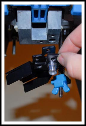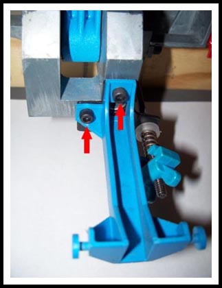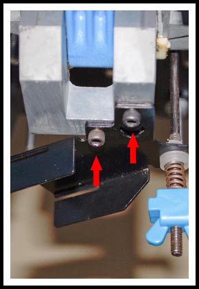 When tightening the screws make sure the Return Bracket and the New Funnel Bracket are aligned with the press bottom so that both edges (shown by the red arrows) clear the handle when the press is cycled.