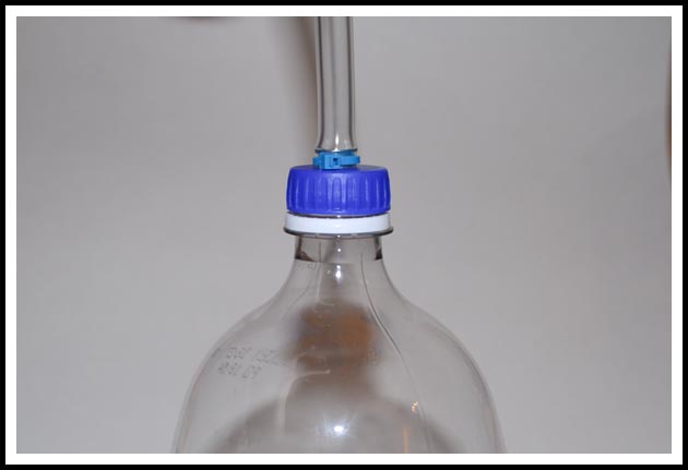 If using a soda bottle double check that the supplied cap fits your bottle before continuing. Insert the bottom hose fitting (the smaller of the two fittings) through the bottom of the cap, it might be a tight fit and inserting it at an angle and then snapping it in is usually the easiest method here.